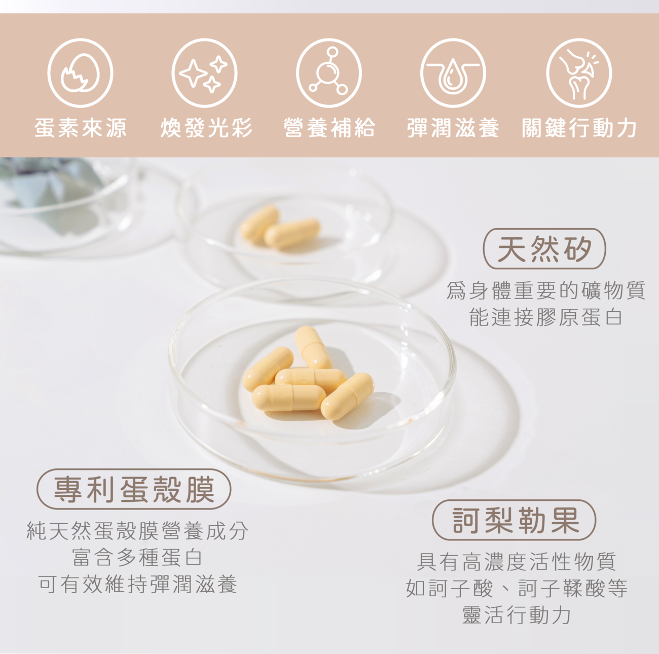 通過專利製程技術獲得,包含 I、V 和 X型膠原蛋白、彈性蛋白、玻尿酸、葡萄糖胺、硫酸軟骨素、溶菌酶和其他蛋白質